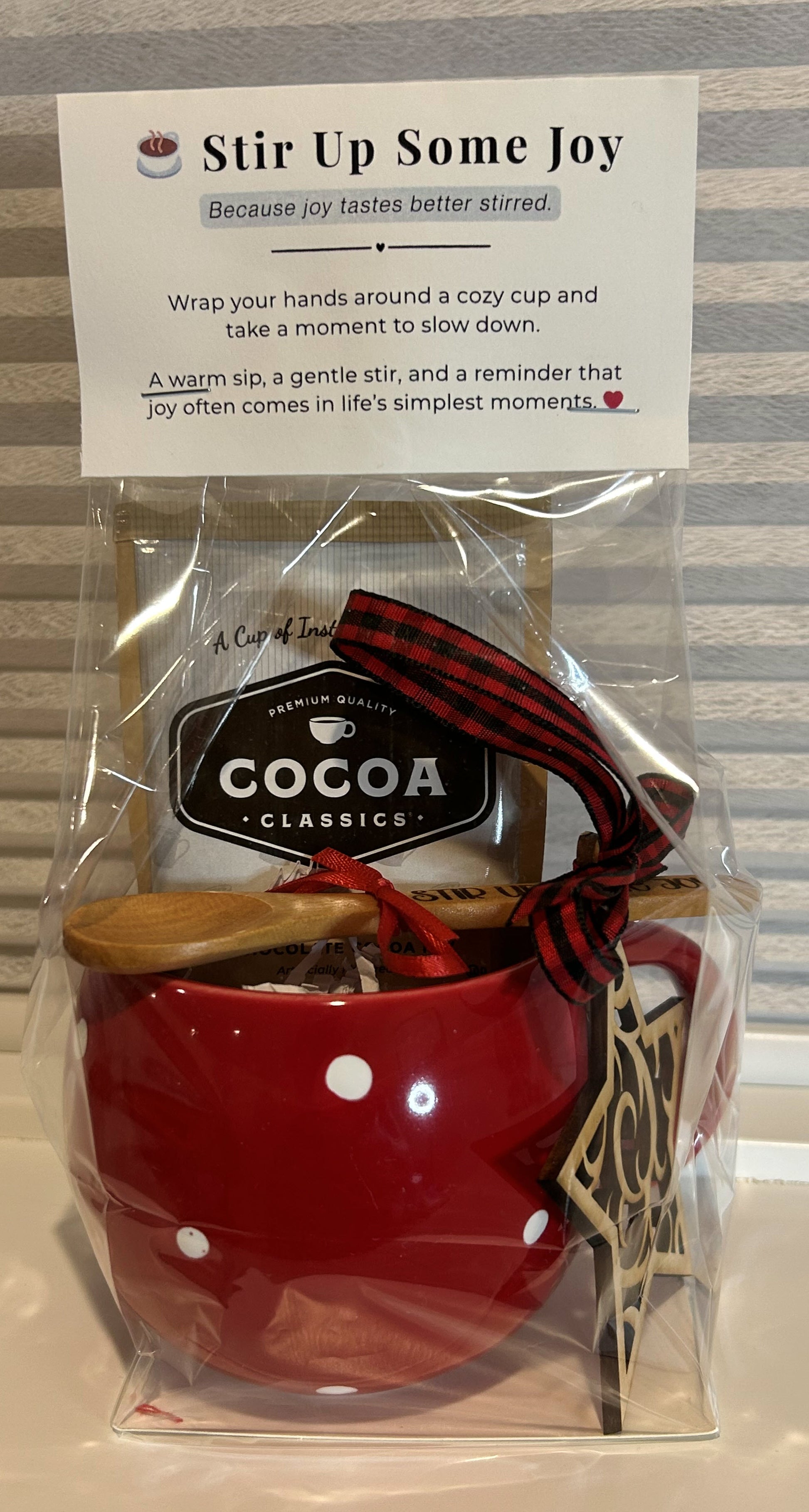 Warm, cozy, and ready for gifting — our Stir Up Some Joy – Star Ornament Holiday Mug Gift Set delivers simple treats and handmade charm. Each set includes a red-and-white polka dot ceramic mug, a laser-engraved wooden “Stir Up Some Joy” spoon, a single-serve hot cocoa mix (flavor varies), and a handcrafted wooden Star Ornament made in-house.