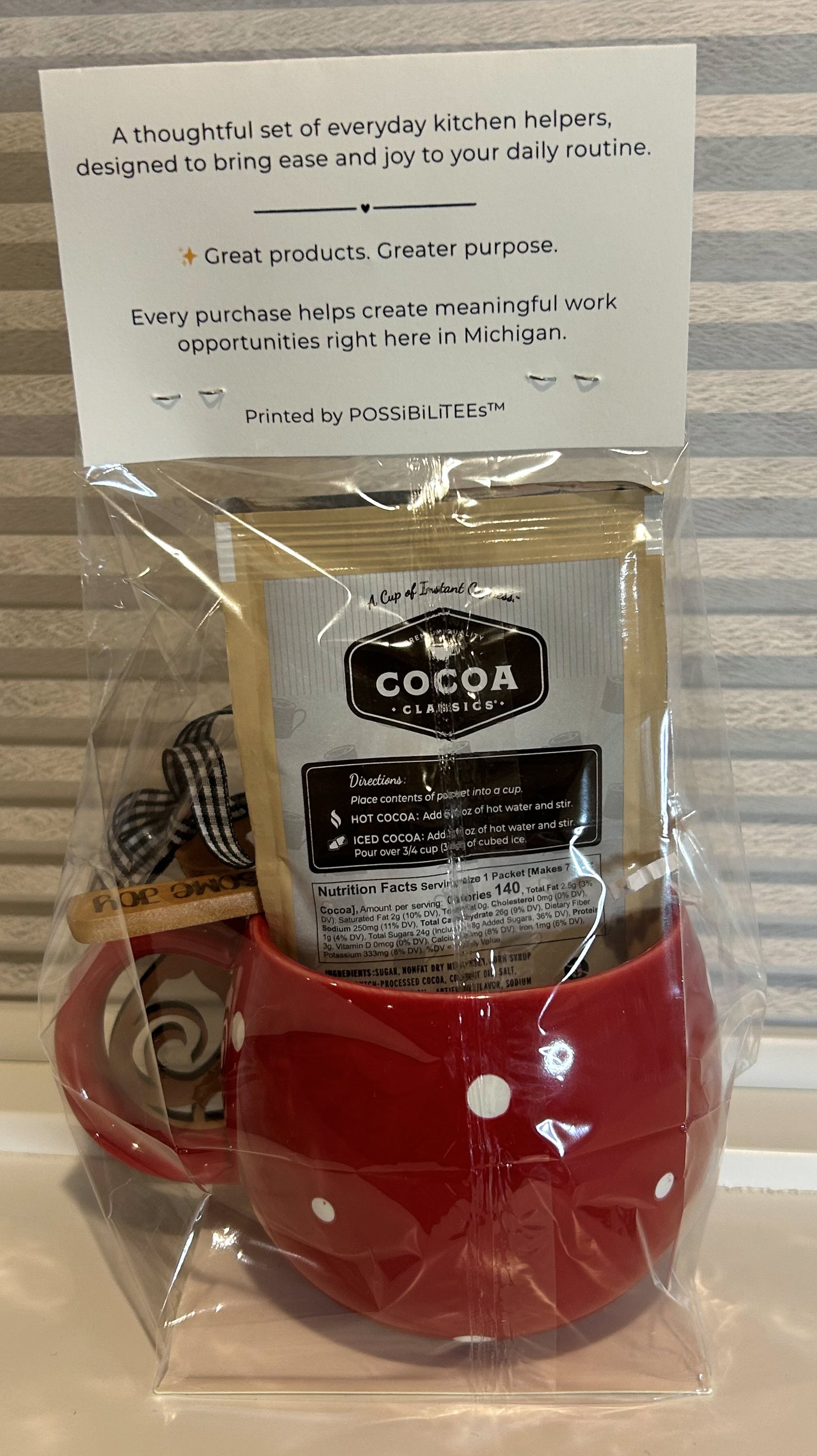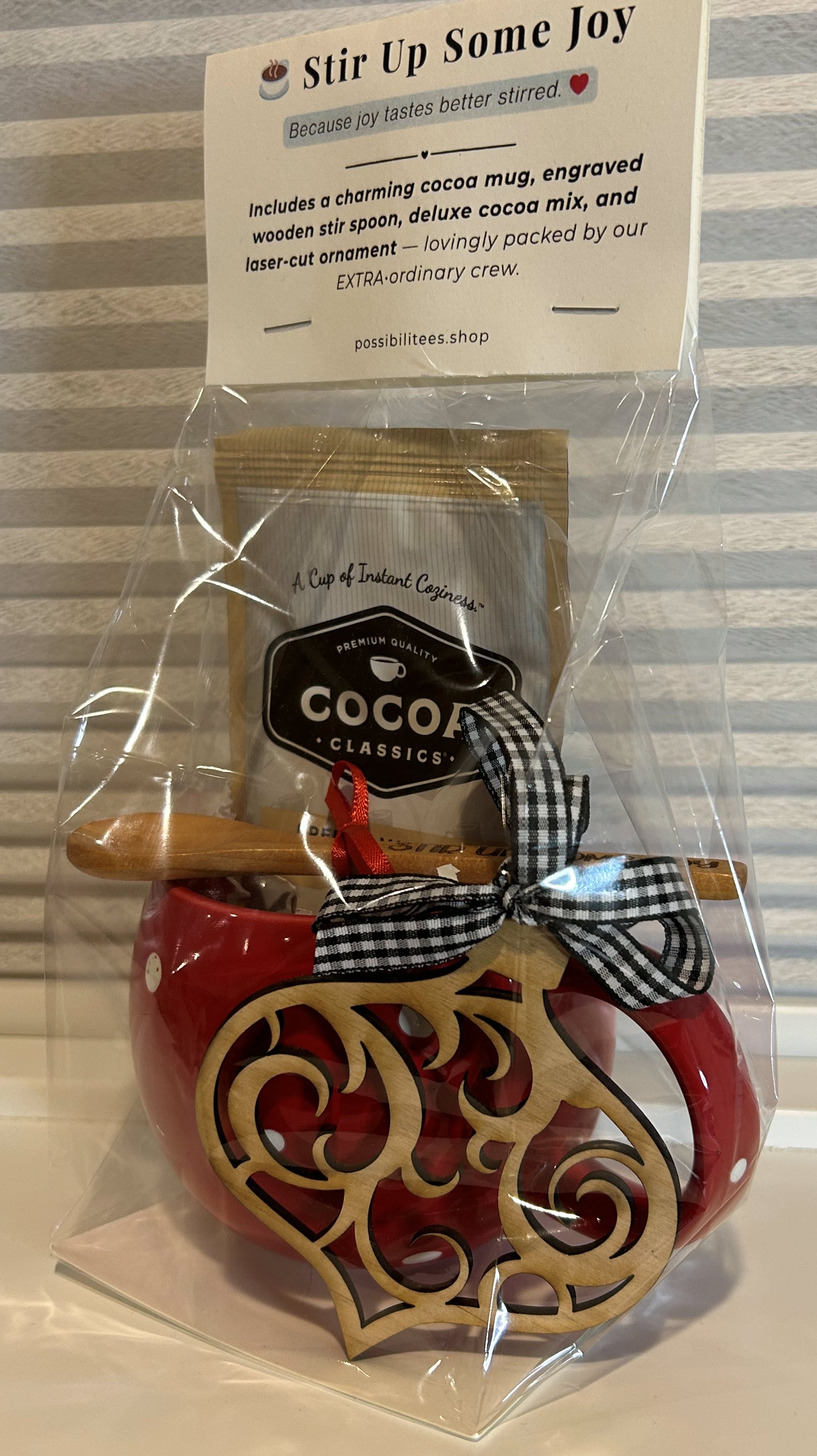 Warm, cozy, and ready for gifting — our Stir Up Some Joy – Teardrop Ornament Holiday Mug Gift Set delivers simple treats and handmade charm. Each set includes a red-and-white polka dot ceramic mug, a laser-engraved wooden “Stir Up Some Joy” spoon, a single-serve hot cocoa mix (flavor varies), and a handcrafted wooden Teardrop Ornament made in-house.
